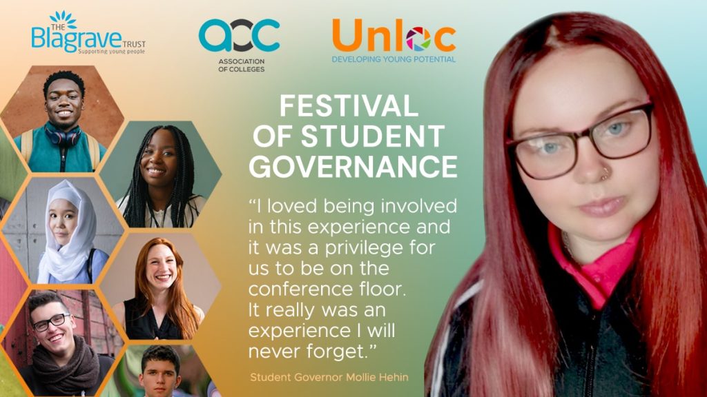 “Hi! I’m Mollie, I’m the Student Union President and a student governor at Dudley College of Technology. Recently, as part of my role I attended the Unloc Festival Of Student Governance and annual Association of Colleges conference in Birmingham. This was an amazing experience and I thoroughly enjoyed it.
