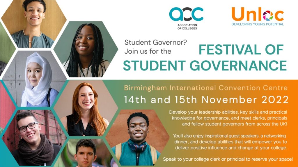 Our annual event for Student Governors from across the UK takes place this November the 14th & 15th at the Birmingham ICC. The Festival of Student Governance is brought to you annually by Unloc in partnership with the Association of Colleges.