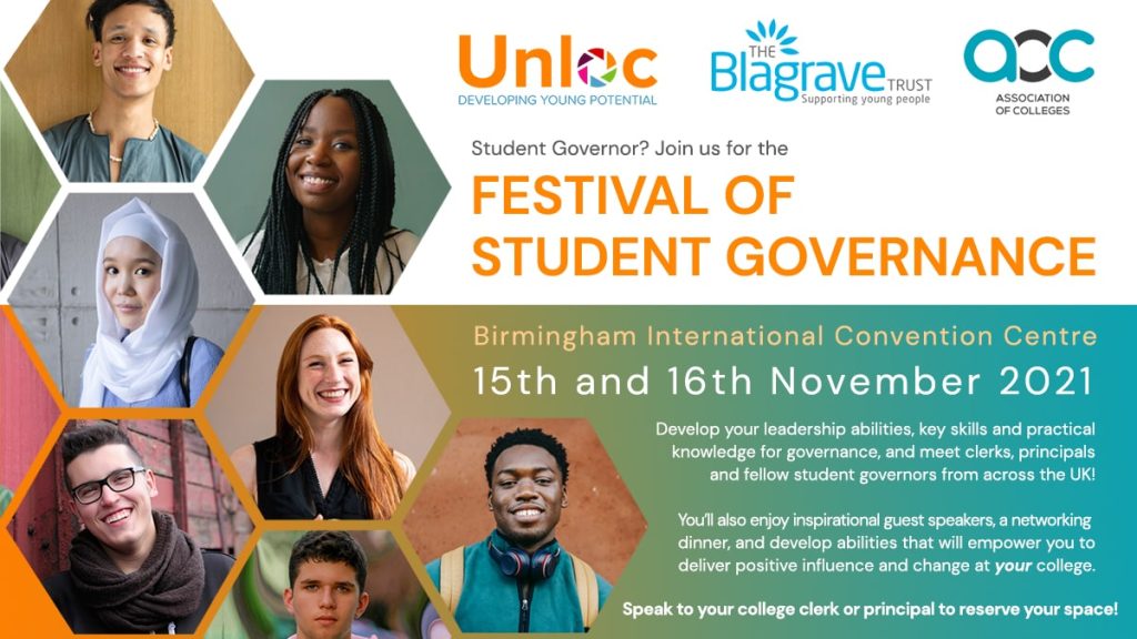 Unloc in partnership with the Association of Colleges and supported by The Blagrave Trust, have organised this unique opportunity to raise the profile of student governors and train them up for their roles at the United Kingdom’s largest further education event.